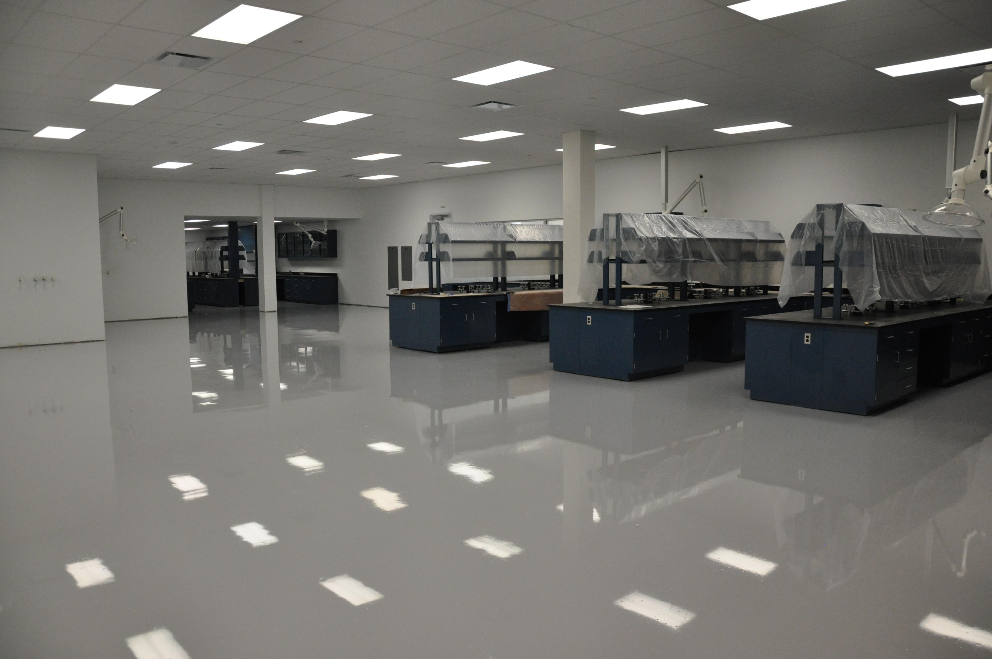 - Topcoat Application: A chemical-resistant urethane topcoat was applied at 3-4 mils thickness. This topcoat provided superior abrasion and chemical resistance, essential for the demanding environment of a tech lab.